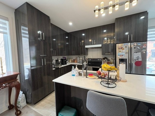 Magnifique maison de ville de 5 chambres, 3 salles de bain complètes et 1 salle d'eau, garage intérieur. Rare et de grande qualité, cette maison de coin offre un cadre de vie spacieux et lumineux, avec parquet et grand balcon. Idéalement situé, à proximité du métro, d'un centre commercial et d'un parc. Accès facile aux autoroutes 15 et 20. Parfait pour les familles nombreuses au mode de vie raffiné. Le rez-de-chaussée comprend un grand salon, une salle à manger, une cuisine et une salle de bain. Le premier étage est composé de trois chambres, Le deuxième étage abrite une suite principale privée et luxueuse, garantissant une intimité totale. --Magnifique maison de ville, 5 chambres, 3 salles de bain + 1 salle d'eau, garage intérieur. - Un bien d'angle rare et de grande qualité. - Lumineuse et lumineuse, parquet, comptoirs en granit, grand balcon. - Le rez-de-chaussée comprend un grand salon, une salle à manger, une cuisine et une salle de bain. - Le premier étage est composé de trois chambres, offrant un refuge paisible et confortable pour la famille et les invités. - Le deuxième étage abrite une suite principale privée et luxueuse, garantissant une intimité totale. - L'agencement harmonieux et le design ouvert optimisent la lumière naturelle et créent une atmosphère chaleureuse et accueillante. - Profitez pleinement des belles journées d'été sur la spacieuse terrasse arrière ! - Emplacement extrêmement pratique, à quelques pas du métro, d'un centre commercial et d'un parc. - À proximité des autoroutes 15 et 20. Idéal pour les familles nombreuses au mode de vie raffiné. - Ne manquez pas cette maison de ville haut de gamme, élégamment conçue et décorée avec goût. Conditions: La culture du cannabis est interdite. Non-fumeur. La location via Airbnb ou toute autre plateforme de sous-location de courte durée est interdite.
