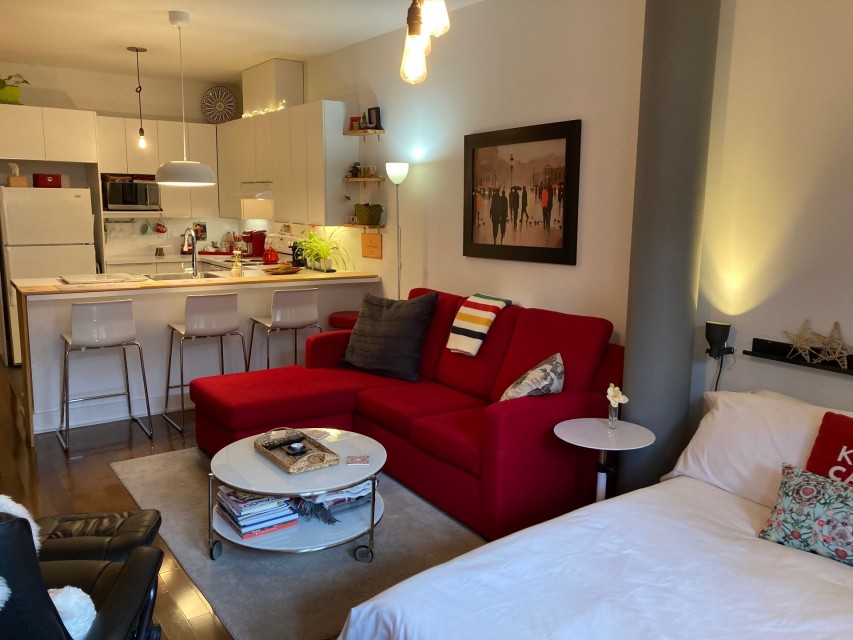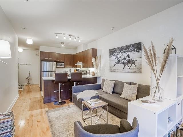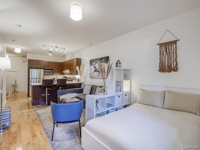 Spacious studio with potential for numerous design options. This gorgeous open concept apt can accommodate a full-sized sofa & bed, has a large kitchen & bathroom, an office nook, and a private garden terrasse. High quality finishings, 9 ft ceilings, A/C unit, private indoor locker, all make this an ideal, cozy home. Located conveniently: 2 minute walk to 197 & 25 bus stops, 11 minute walk to Rosemont metro, 10 minutes drive to the highway. Nearby Park Père Marquette offers playgrounds, skatepark, skating rink, dog run, sports fields. Parking not included in the sale. Appliances included. Cabinetry ready for dishwasher. Lease-end 03/27.