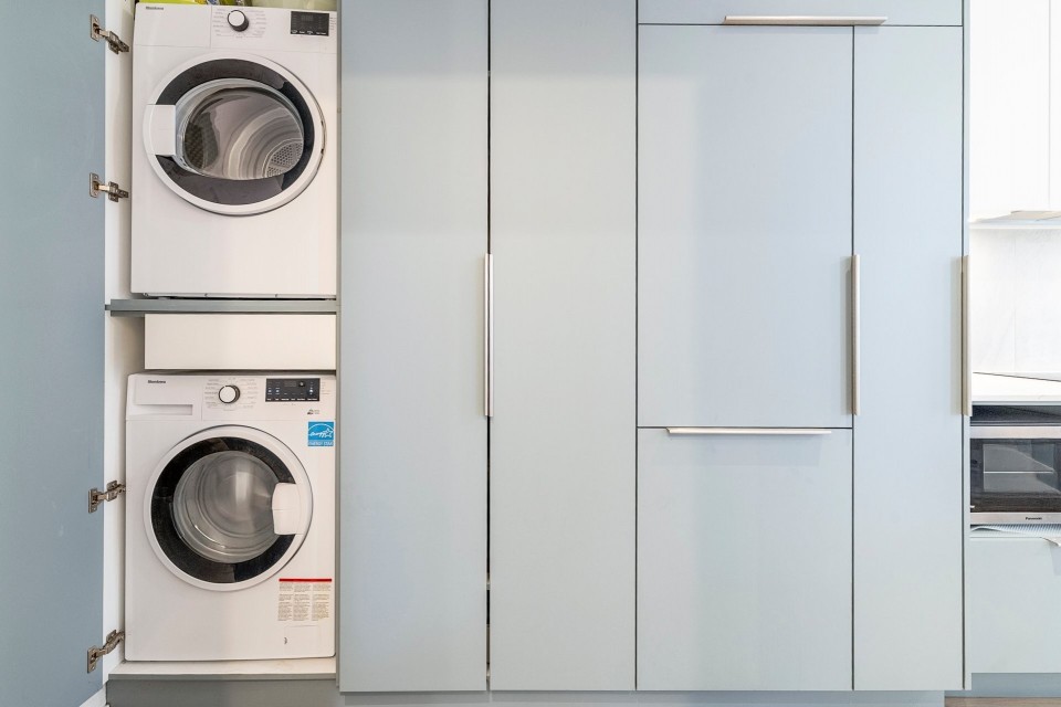 Fridge, stove, washer, dryer, dishwasher, sofa, bed, table and chair