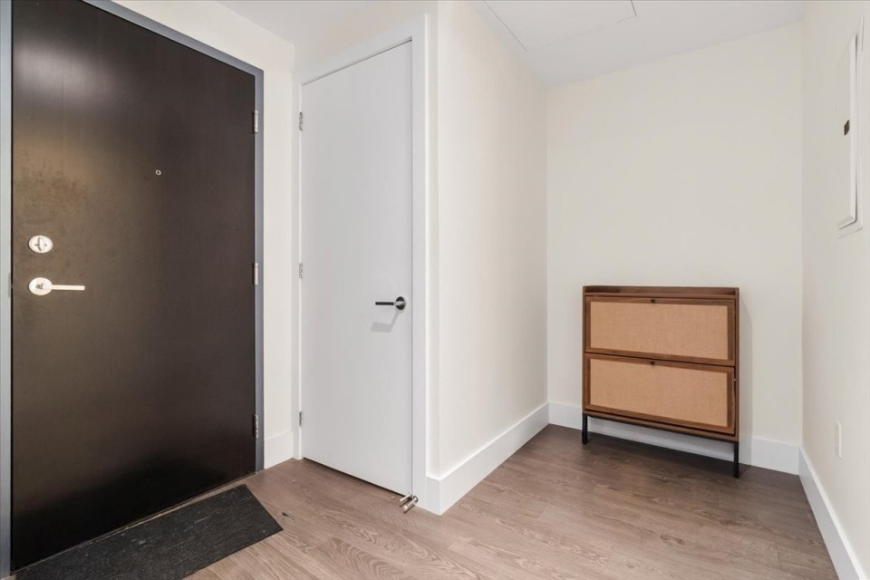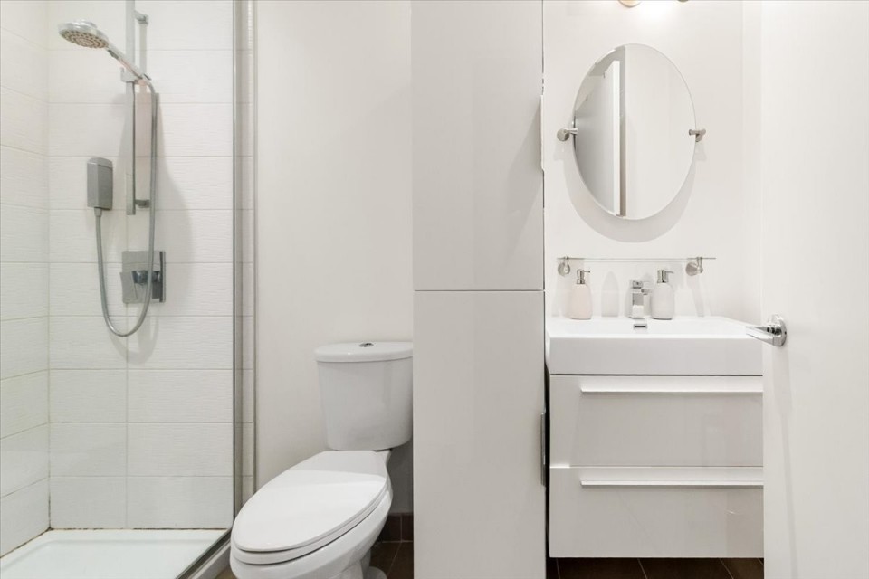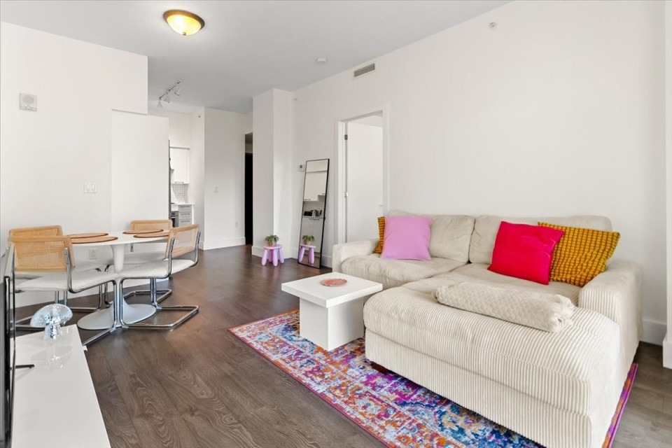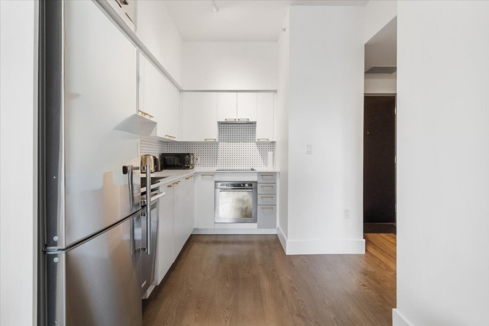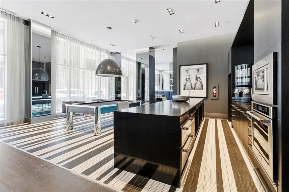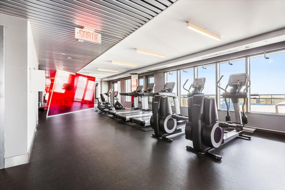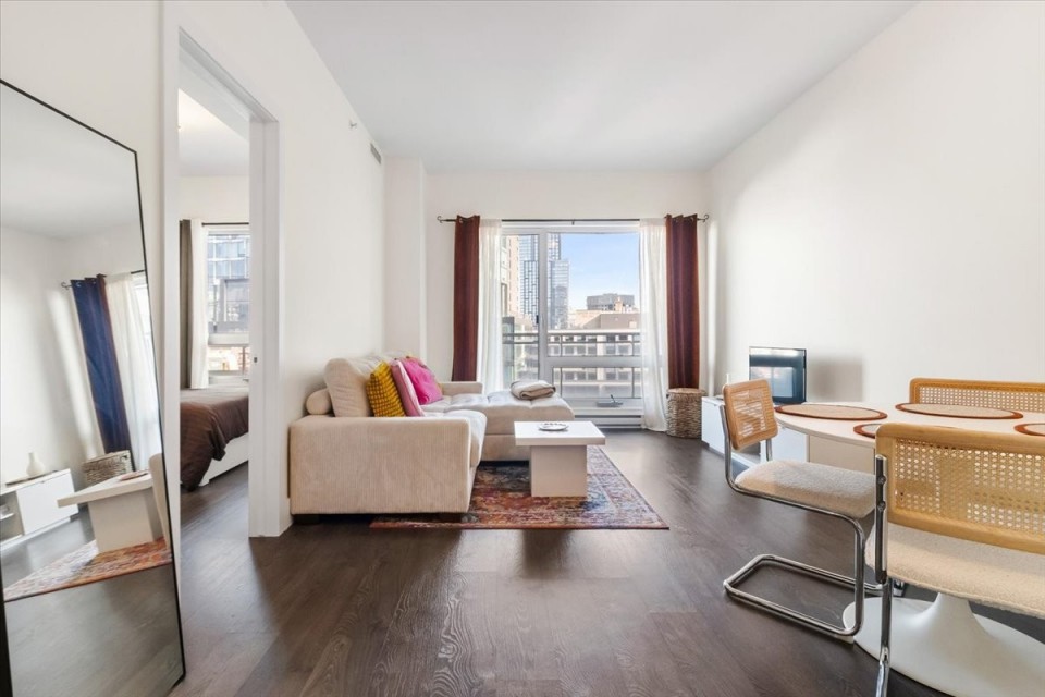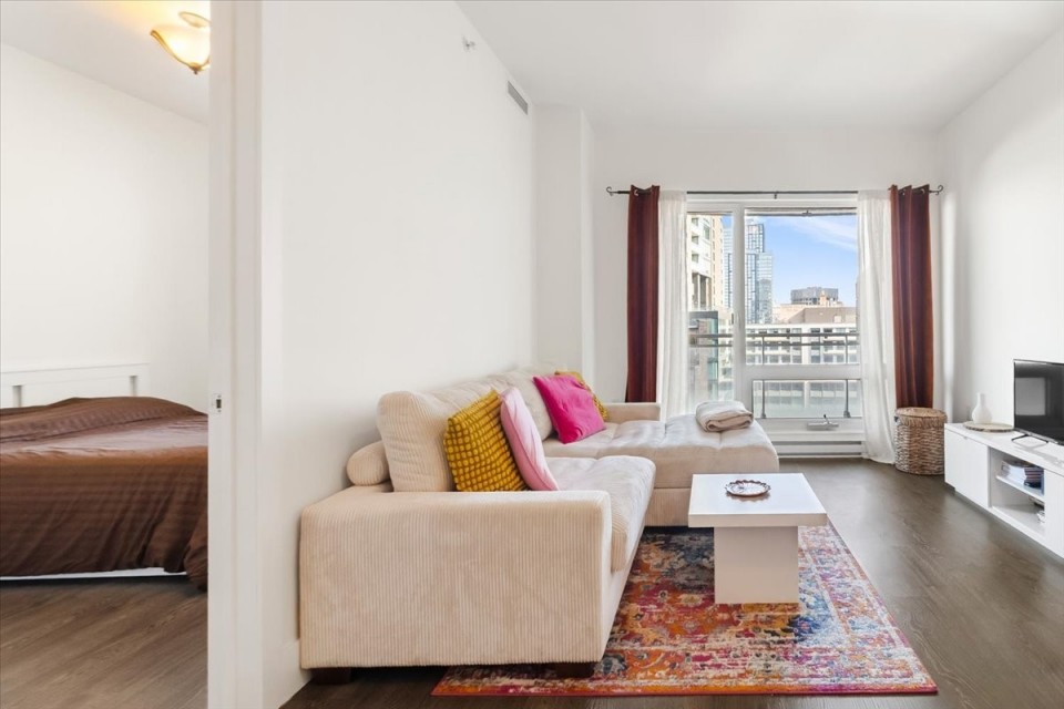 Bright and large 14th flr one bedroom unit in the chic LE PETERSON CONDOS offers 1 a closed bedroom + open den, large windows, big balcony, and all the amenities of this luxury building. Buy this immaculate condo and live within steps to the festival & entertainment area, McGill University, UQUAM, the financial sector, restaurants, as well as the Place Des Arts metro station. The apartment is rented till March 31 2026. 1 bedroom condo offering an additional work space that can be used to create office/study corner or to accommodate extra storage options. The luxurious Le Peterson building offers you 24/7 security, 3 high speed elevators, a guest suite for your overnight visitors, and FIVE (5) common spaces for socialising. On the ground floor there is 1) a party/games room with large screen television, Fuzball & pool tables, popcorn and Nespresso machines, a presentation kitchen for your events, and washrooms and vanity for your guests 2) a quiet piano lounge, and 3) a bike repair and exercise room. The 28th floor has 4) an open skydeck with a 3 flr climbing wall, BBQ, sunning and eating areas, and 5) a gym, situated on the south-east corner and surrounded by wrap-around floor to ceiling windows offering a grand view of the Entertainment District and the St Laurent River!