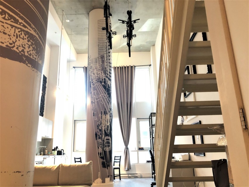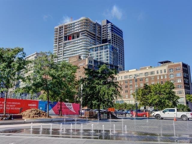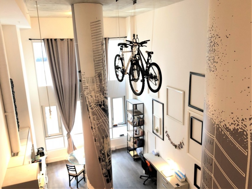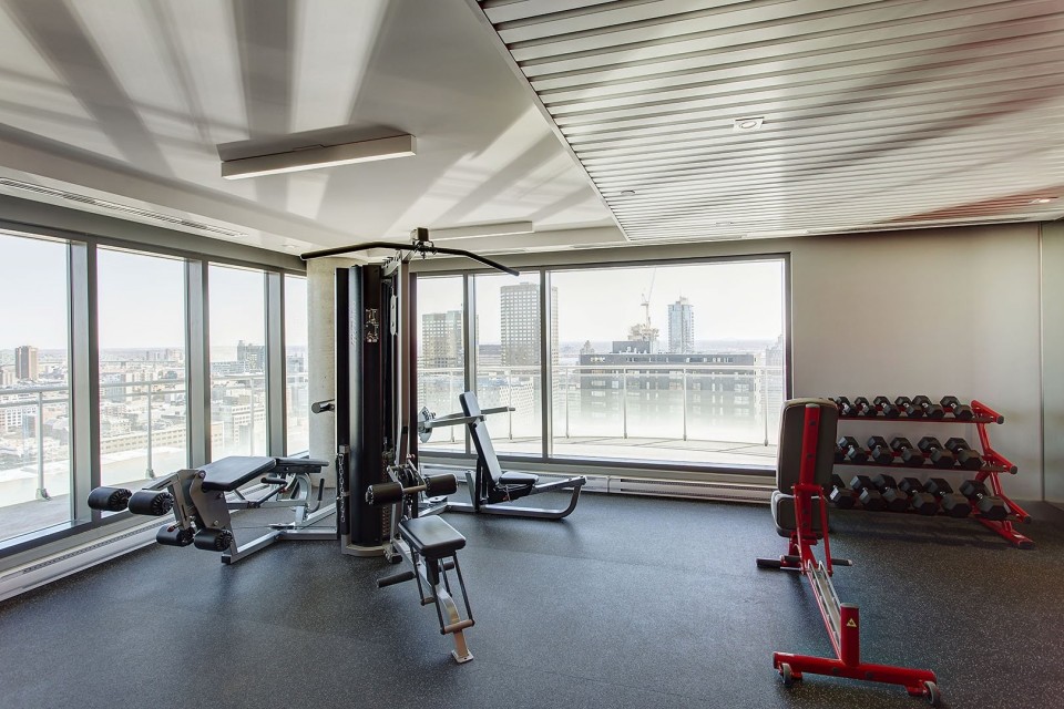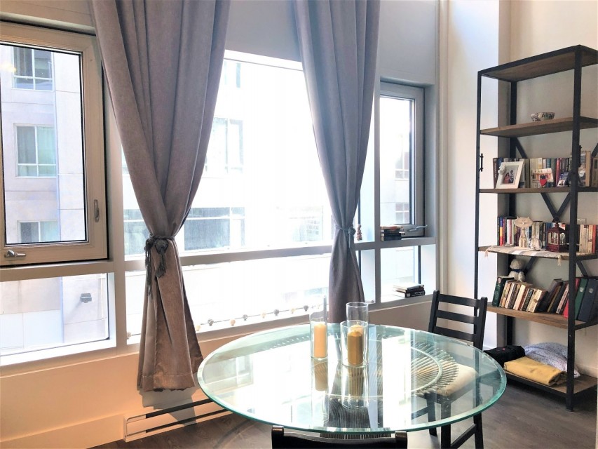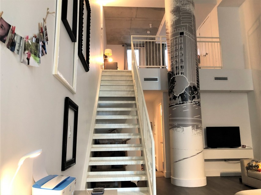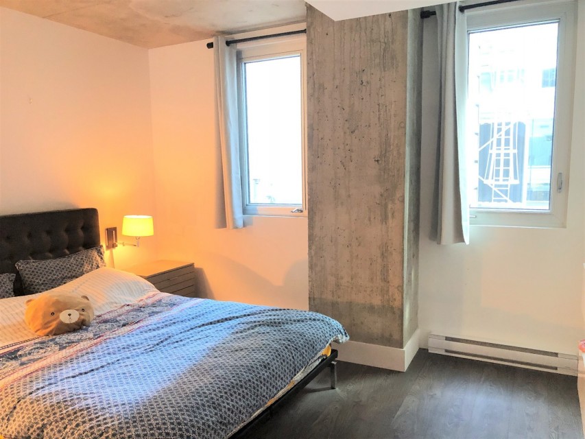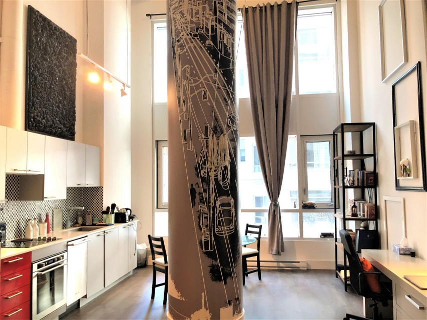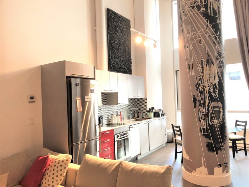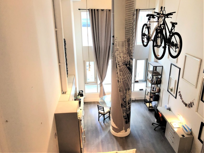 Le Peterson furnished Condo 2 flr Loft ! Spectacular and airy w/18 ft ceilings and enormous windows. Plenty of sunlight enters this ultra hip & spacious residence. Rent this condo and be close to McGill University, the new hospital, public transport and the Quartier des Spectacles with all its free outdoor performances! The tenant shall not touch the bikes suspended from the ceiling. Available August 01 2026. This condo is unique as it is a spacious and airy loft on 2 floors with a bedroom on the mezzanine and a large open area on the main level comprising living room, dining room, kitchen, bathroom and equipped laundry room. The ceiling is 18 feet high with large floor to ceiling windows letting in direct sunlight. the mezzanine level has windows also allowing light morning and afternoon. The kitchen is fully equipped with modern stainless steel appliances, quartz countertops and a large stainless sink. The luxurious Le Peterson building offers you 24/7 security, 3 high speed elevators, a guest suite for your overnight visitors, and FIVE (5) common spaces for socialising. On the ground floor there is 1) a party/games room with large screen television, Fuzball & pool tables, popcorn and Nespresso machines as well as a presentation kitchen for your events, 2) a quiet piano lounge, and 3) a bike repair and exercise room. The 28th floor has 4) an open skydeck with a 3 flr climbing wall, BBQ, and sunning area, and 5) a gym, situated on the south-east corner and surrounded by wrap-around floor to ceiling windows offering a grand view of the Entertainment District and the St Laurent River! Please note, no pets, no short term subletting, no smoking, no cannabis will be permitted in the apt. Tenant must acquire tenant insurance with civil liability before moving in, and pay the moving fees of the building. The furniture included shall be those seen during the visit, namely: Entrance closet Glass dining table L shaped sofa sofa Shelving unit in dining room Grey desk Tv and Tv stand affixed to the wall Queen Size Bed 2 bed-side tables with 2 lamps 2 bedroom shelves affixed to the wall bathroom mirror