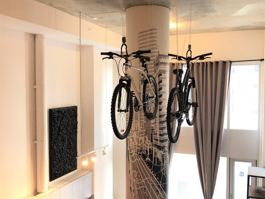 Electricity, heating, TV cable, internet, telephone, dining chairs. The tenant shall not touch the bikes suspended from the ceiling.